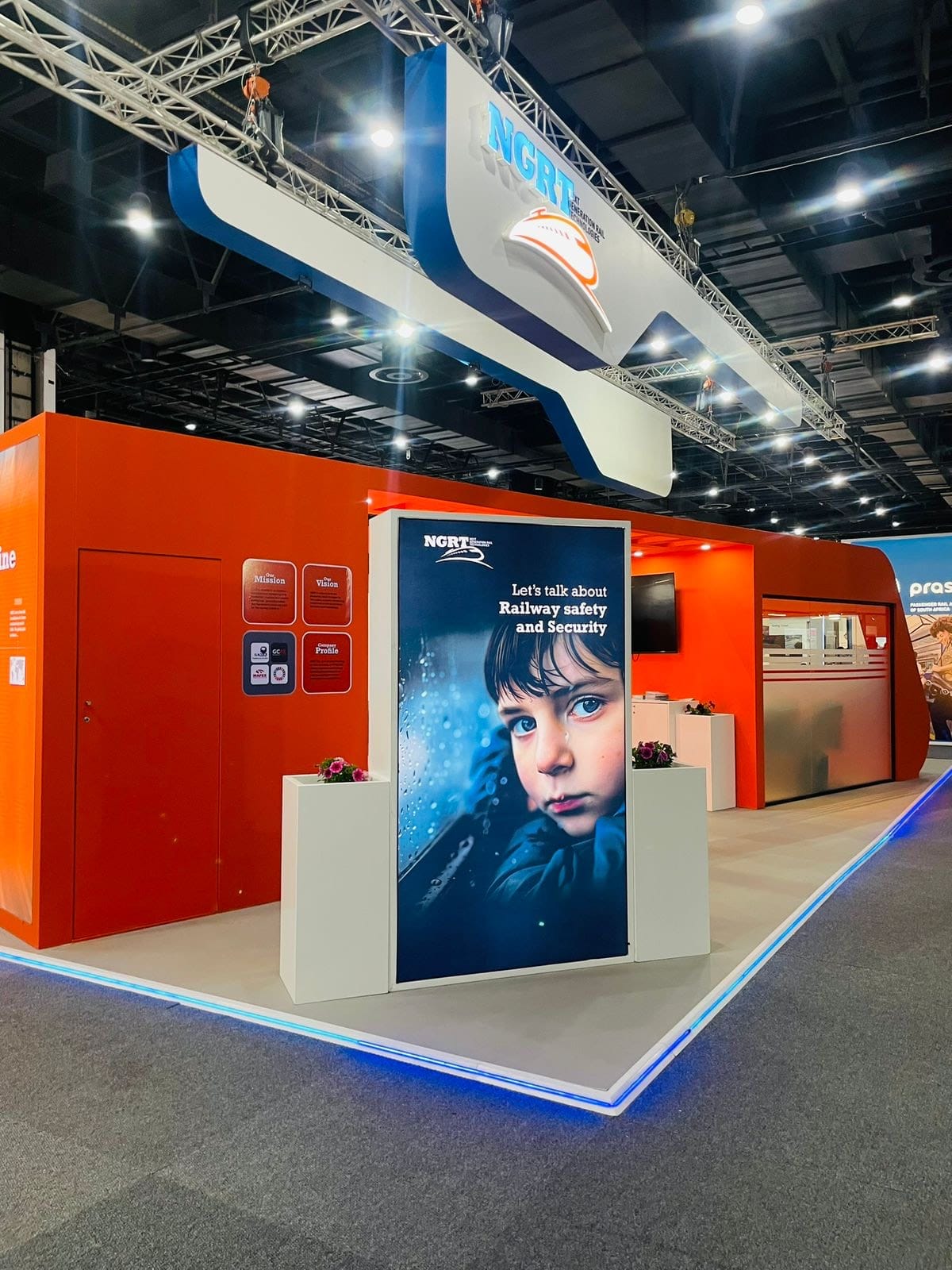 NGRT required a spacious and striking stand to demonstrate the future of rail technologies. The goal was to provide an engaging platform for discussions with stakeholders while showcasing technical models and branded messaging.